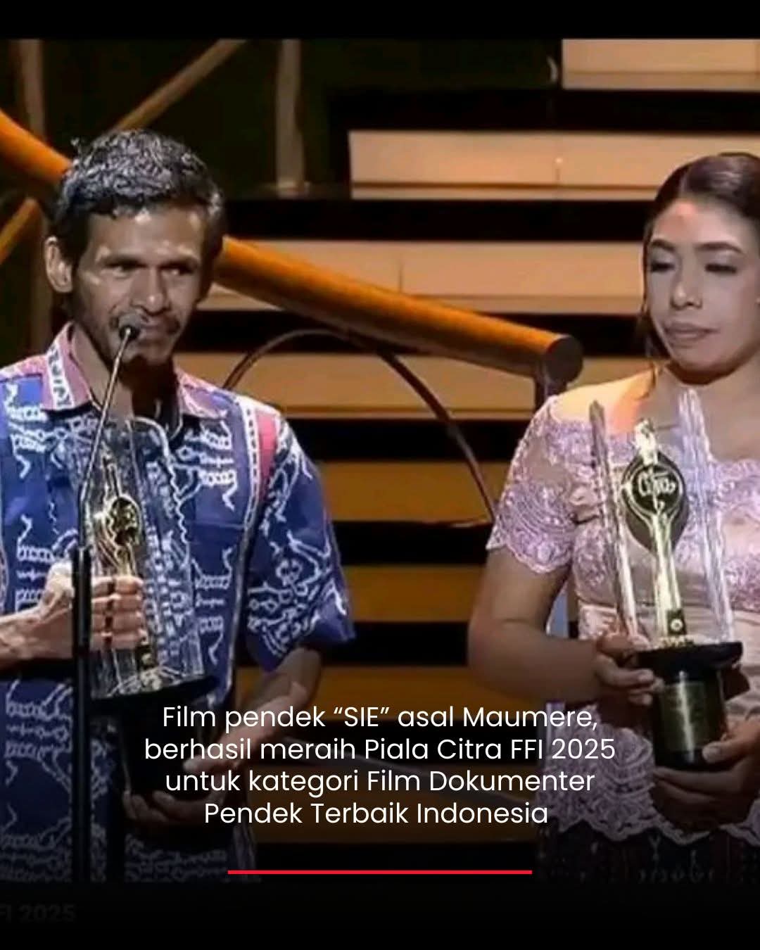 JAKARTA – KABAR bahagia datang dari Jakarta. Film pendek “SIE” asal Maumere, Kabupaten Sikka–Flores, resmi menorehkan sejarah baru. Karya ini berhasil meraih Piala Citra FFI 2025 untuk kategori Film Dokumenter Pendek Terbaik Indonesia pada malam puncak Festival Film Indonesia, Kamis, 20 November 2025 malam lalu.
