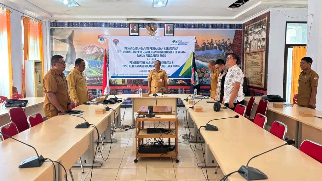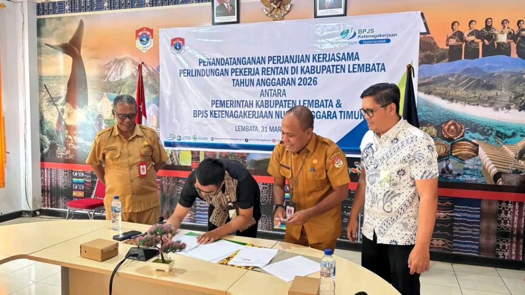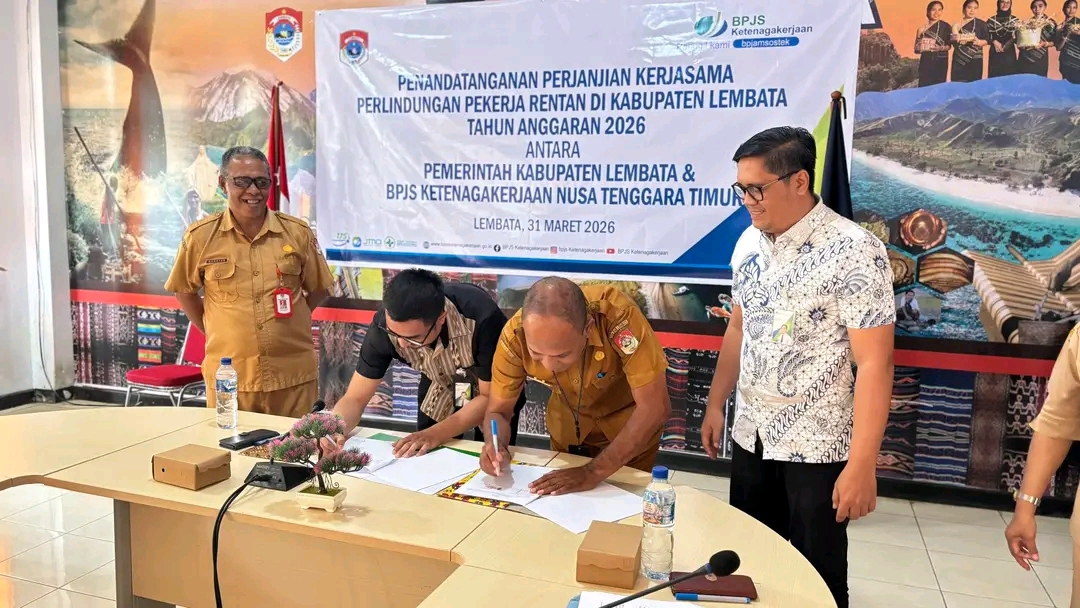 LEWOLEBA — PEMERINTAH Kabupaten Lembata bersama Badan Penyelenggara Jaminan Sosial (BPJS) Ketenagakerjaan Kantor Cabang Nusa Tenggara Timur resmi menandatangani Perjanjian Kerja Sama tentang penyelenggaraan Program Jaminan Kecelakaan Kerja (JKK) dan Jaminan Kematian (JKM) bagi pekerja rentan di Kabupaten Lembata.